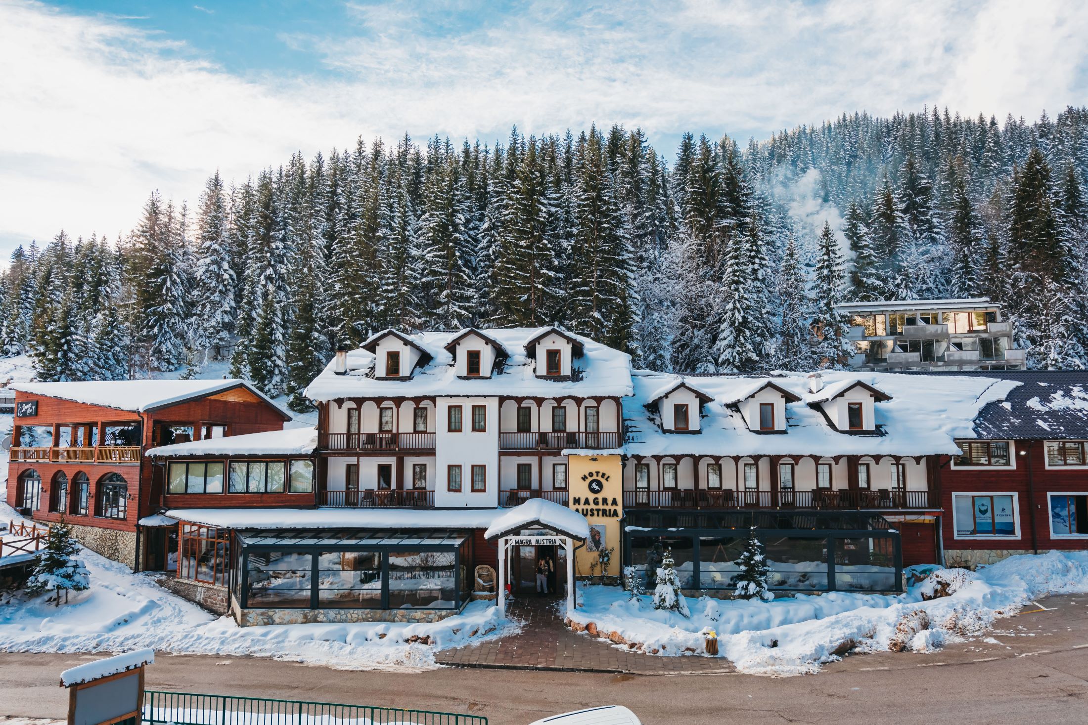 AUSTRIA MAGRA Family Enterprise is a natural eco-hotel. Austria Magra is one of the best hotels in Boge, Kosovo. He rises amid a stunning landscape, in an area with curative climate, unaffected by air pollution and it acoustic. The hotel is situated 1450m above sea level, just 115 km away from Pristina.Aromatic mountain air, tranquillity, untouched nature, captivating scenery, crystal pure mountain spring water, cordial service, high class quality, special dishes, children"s playground, variety of wellness offering in the hotel premises – and many other conditions are available for a relaxing and tonic holiday. This holiday yields gain in a few days of stay in this hotel.Spirit is injured by adverse experiences; positive experiences strengthen it. AUSTRIA MAGRA is a place where the soul renews and is a center for a season restful holiday for body and psyche, ears, eyes, heart and mind. In MAGRA AUSTRIA mountain forests and alpine meadows reach the dining table. It is worth of visiting the hotel at all seasons!Bustling alpine spring enlivens exhausted limbs. Moving in the fresh mountain air activates defensive cells, which purify the body of the destroyed and off-use cells.Summer offers unimaginable opportunities, such as mountain hiking, sports hiking, alpine climbing. On the other hand, lawns invite you in their arms providing you with dreams and escape.In the autumn, movement of clean-air, especially in windy weather, enlivens blood circulation and the supply of body with blood thus strengthening the immune system. Special offers for wellness treatment are the best means of winter anti-depressants and anti-fatigue. Implementation of Kneipp treatment protects the body from cold.Winter freezes with the snow storms, petite snow, winter sun baths on the terrace, with chilling coldness in mountain forests covered by fabulous snow and the lulling warmth in the premises of the hotel. At the hotel you will find all possibilities to make your vacations in Kosovo memorable.